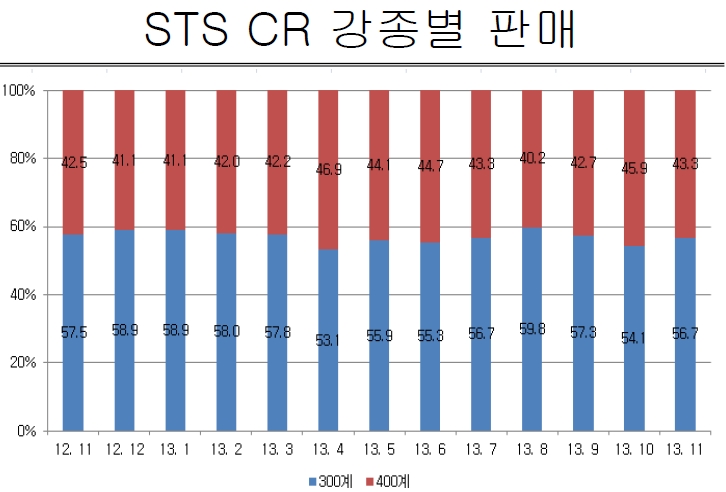 한국철강협회 스테인리스스틸클럽(회장 서영세)에 따르면 지난 11월 400계 스테인리스 냉연 제품의 판매 비중은 43.3%로 전월대비 2.6%p 낮아졌다.