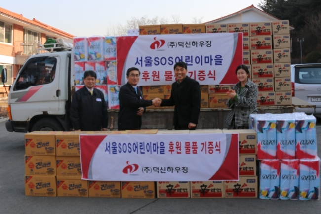 건축용 데크플레이트 생산기업 덕신하우징(회장 김명환)은 지난 27일 설날을 앞두고 서울 양천구에 있는 아동복지시설인 '서울SOS어린이마을'을 방문해 후원물품을 기증했다.