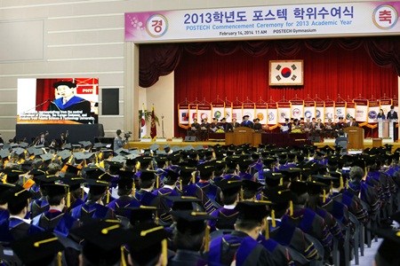 POSTECH(포항공과대학교)은 14일 오전 11시, 대학 체육관에서 졸업생과 학부모, 정준양 이사장, 김용민 총장을 비롯한 교내외 인사 2,500명이 참석한 가운데 2013학년도 학위수여식을 가졌다.(사진 참조)