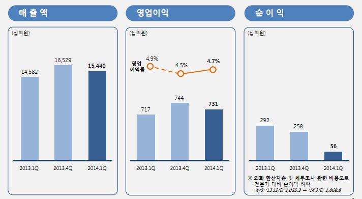 포스코는 24일 진행한 ‘2014년 1분기 기업설명회’에서 15조4,400억원의 매출을 기록했다고 밝혔다. 이는 전분기에 비해 1조890억원 줄어든 수치다.
