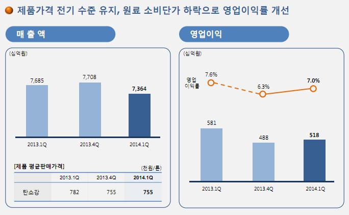 관련기사 (포스코IR) 포스코, 1분기 요약 손익계산서 (포스코 IR 2014년 1분기) 1분기 조강 생산 감소 (포스코IR) 포스코, 1분기 비철강부문 수익성 개선 (포스코 IR 2014년 1분기) 1분기 부채 증가