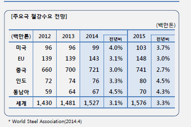 포스코(회장 권오준)는 24일 콘퍼런스콜을 통한 기업설명회를 통해 선진국 수요는 경기회복에 힘입어 3%의 회복세로 전환할 것이라고 전망했다. 중국의 경우 경제성장 둔화로 철강수요는 3% 증가할 것이라고 전망했다. 박재철 parkjc@snmnews.com 다른 기사 보기 관련기사 (포스코IR-질의응답) “2005년으로 돌아가자” 저작권자 © 철강금속신문 무단전재 및 재배포 금지