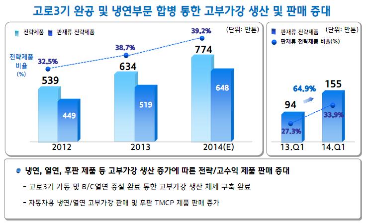 현대제철은 25일 한국거래소에서 진행한 1분기 경영실적 설명회에서 “3고로 가동 및 B/C열연 증설과 냉연부문 합병을 통한 고부가강 생산 체제 구축을 완료했다”며 “자동차용 냉연 및 열연 고부가강 판매와 후판 TMCP 제품 판매가 증가했다”고 밝혔다.