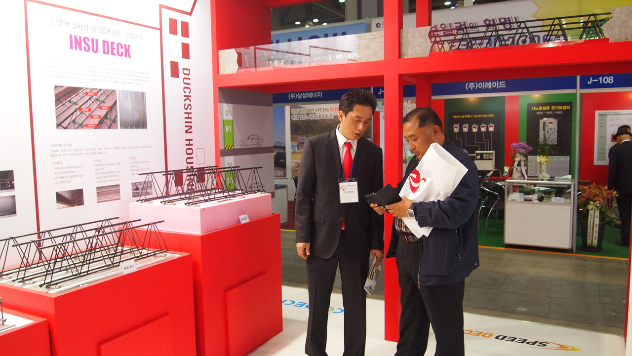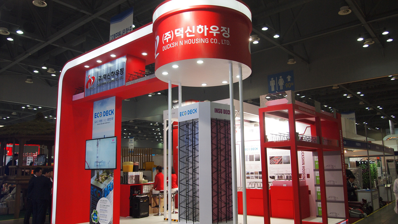 덕신하우징은 이번 전시회 현장에서 실제 건축 현장처럼 구조물을 설치해 관람객들이 직접 체험할 수 있는 체험관을 마련했다. 이에 덕신하우징은 관람객들에게 데크플레이트의 시공 전, 시공 후 모습을 전시관에 담아 일체형 데크의 우수성을 알렸다.