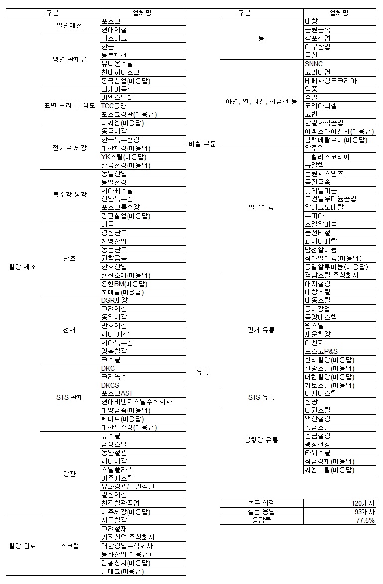 지난 2011년 처음으로 시작된 이 설문조사는 지난해부터 기존 설문 대상이었던 철강·비철 제조 업체 외에 대표 유통 업체들을 추가해 총 120사 규모로 진행하고 있다.