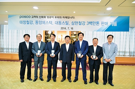 포스코(회장 권오준)는 지난 16일 포스코 제품 판매누계량 300만톤을 달성한 지정 가공센터 대표들을 초청해 기념행사를 개최하고 감사패를 전달했다.