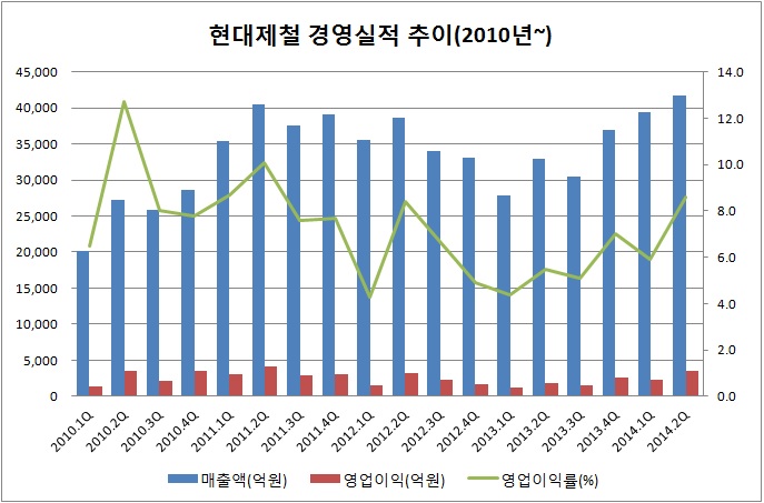 매출액은 생산량 증가에 힘입어 2011년 2분기 이후 분기 4조원 시대에 재진입 했으며, 수익성 지표인 영업이익도 철강업계에서 상위권을 형성하고 있다. 이번 2분기 영업이익률은 일관제철 1위 업체인 포스코를 앞지르며 냉연사업 합병에 따른 시너지와 캡티브마켓을 통한 안정적인 수익 기반 성과를 창출했다.