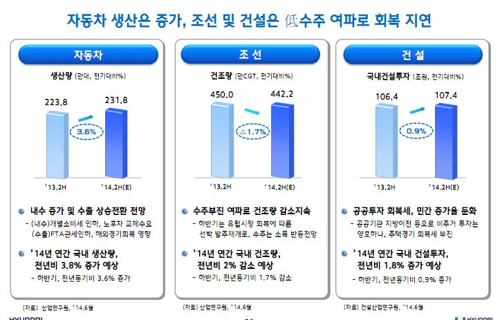 올해 자동차 생산량은 증가하는 반면 조선 및 건설은 저수주 여파로 회복이 지연될 것으로 보인다.
