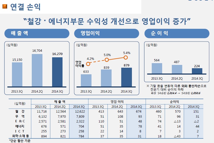 철강 및 무역 부문의 순이익 감소는 환율 영향이 컸던 것으로 보인다.