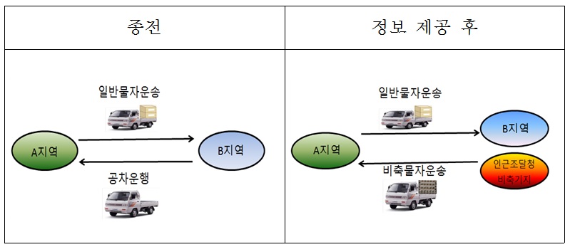 한편, 우리나라 화물차량 공차율은 40.2%(이하 2011년 기준)에 달해 27%인 미국과 28.7%, 25.1%인 영국 및 프랑스보다 훨씬 높은 편이다. 조달청은 화물차량의 공차율이 20%대가 되면 연 10조원 이상의 물류비가 절감될 것으로 추산되며, 공차율을 1%만 줄여도 도로 수송비가 연간 1조5,330억원이 절약될 것으로 예상했다. 우리나라의 물류비는 130조6,939억원으로 이 중 도로 이용 화물 운송이 91조6,640억원(2010년 기준)으로 전체 물류비의 70%를 차지한다.