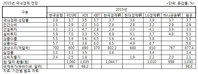 또 기관별 평균 전망치를 살펴보면 2015년에는 수출이 평균 5%가량 증가하면서 성장률이 소폭 개선되지만, 수입 역시 5.8% 증가해 수출 증가율을 앞설 것으로 예상됐다. 특히, 경상수지 흑자는 평균 677억달러로 올해 대비 큰 폭 감소가 예상됐다. 이 외에 소비자물가 상승률은 평균 2.1%, 국제 유가(두바이유)는 배럴당 98.6달러가 전망됐다.
