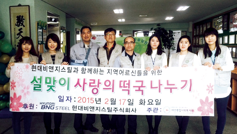 이날 행사에 참여한 현대비앤지스틸 임직원들은 직접 250인분의 떡국을 마산 지역사회 어르신들에게 대접 했으며, 거동이 불편한 어르신들에게는 도시락을 배달했다. 구정 연휴를 하루 앞두고 진행한 이 날 행사에서는 떡국 나눔 외에도 다과를 대접하고 담소를 나누며 뜻 깊은 시간을 보냈다.
