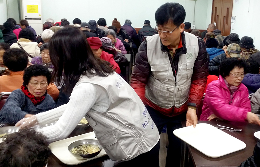 ▲ 현대비앤지스틸 임직원들이 설맞이 떡국 나눔 행사를 맞아 어르신들에게 떡국 배식 봉사활동을 하고 있다.