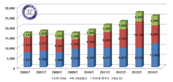 한편, 최근 마그네슘 원자재 전체 수입량을 보면 스마트폰 시장 성장세로 마그네슘 수요가 급증했던 2013년에 가장 최대치를 사용했고 이때 수입량은 2만7,221톤이었다. 그러나 지난해는 2013년 수입량에 미치지 못하는 2만5,516톤에 그치고 있어 저조한 마그네슘 시장 실적을 기록했다.