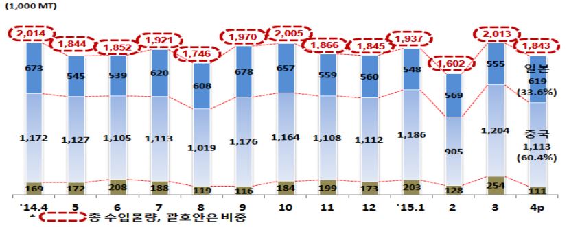 한국철강협회가 발표한 철강수입속보에 따르면 3월 국내 명목소비 대비 수입산 비중은 44%까지 확대됐다. 중국산의 국내 명목소비 대비 시장점유율은 전년동월대비 4.7%P 하락한 26.3%를 차지했다. 일본산은 12.1%로 2.3%P 축소된 것으로 나타났다.