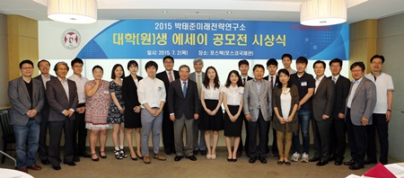 포항공과대학교(POSTECH) 박태준 미래전략연구소(소장 최광웅)는 2일 오전 11시 포스코국제관에서 지난 4월 1일부터 5월 31일까지 ‘10년 내 한국사회가 당면할 가장 중요한 이슈는 무엇이며, 어떻게 대처해야 하는가?’라는 주제로 공모한 ‘2015대학·대학원 에세이’ 시상식을 개최했다.장학금 300만원씩 부상으로 지급하는 대상 2편에는 이화여대 약학과 5학년 박유진, 박윤정 팀의 ‘전염병 예방 어디까지 준비했니?’, POSTECH 융합생명공학과 문숙진의 ‘목소리를 내는 연습’이 뽑혔으며, 장학금 10만원씩 지급하는 우수상에는 서울대학교 자유전공학부 3학년 김지섭의 ‘시대변화에 따른 대학 개혁의 필요성과 구체화 방안’을 포함해 10편이 뽑혔다. <사진-참조>