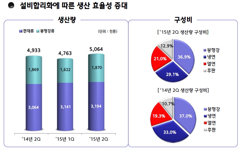 생산 제품별 비중은 봉형강 제품이 36.9%로 가장 컸고 냉연 부문이 29.1%를 차지했다. 열연부문은 21%, 후판은 12.9%를 차지했다. 냉연 부문의 비중이 3.9% 낮아진 반면 후판과 열연 부문에서 생산이 증가했다.