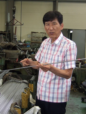 자전거 안장 원 소재는 포스코에서 생산되는 SUP 9 스테인리스 선재를 갖고 인발과 직선절단, QT 열처리 후 연마공정을 거쳐 스프링강이 생산된다고 말했다.