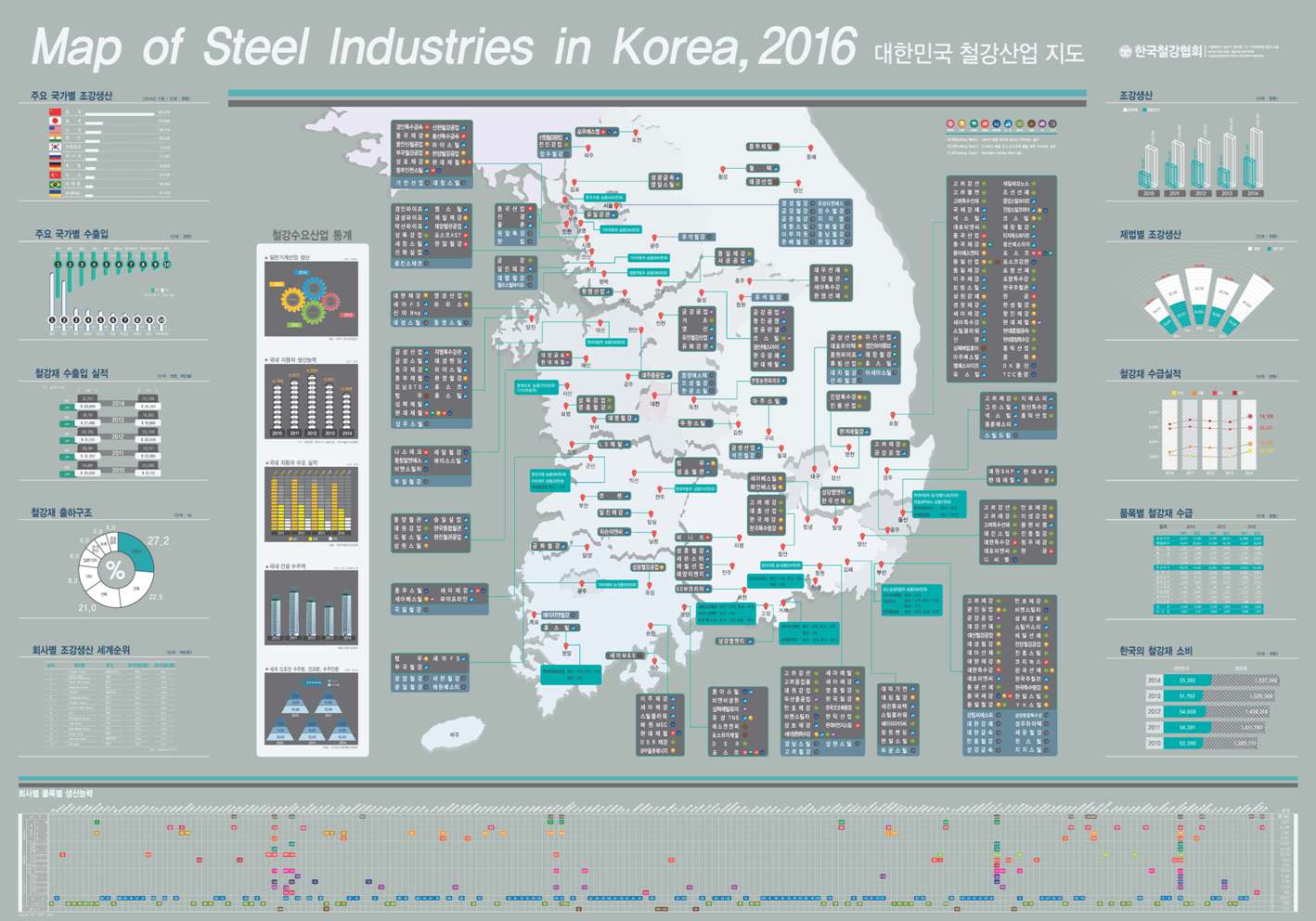 한국철강협회 철강홍보위원회(위원장 김상규, 현대제철 전무)는 국내 철강 제조사 및 주요 유통업체, 자동차, 조선 등 철강 수요업계의 위치를 한 눈에 볼 수 있는 2016년판 국내 철강산업 지도를 제작했다고 9월 7일 밝혔다.