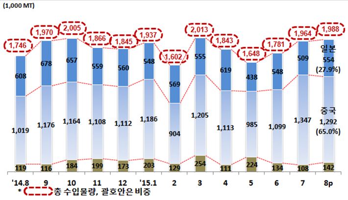 일본산 수입은 55만4,000톤으로 전년동월대비 8.9% 감소한 반면 전월대비 8.9% 증가하며 55만톤 수준을 나타냈다. 비중 또한 소폭 확대되며 전체의 27.9%를 차지하는 것으로 조사됐다.
