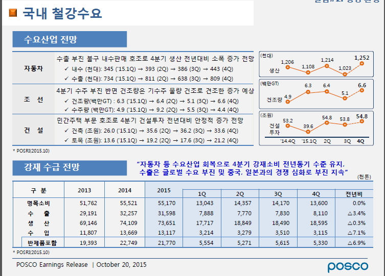 포스코는 자동차 등 수요산업 회복으로 4분기 철강재 소비는 전년과 비슷한 수준을 유지할 것이라고 밝혔다. 또한 회사는 수출판매는 글로벌 수요 부진 및 중국과 일본 등의 경쟁 심화로 부진이 지속될 것이라고 말했다.