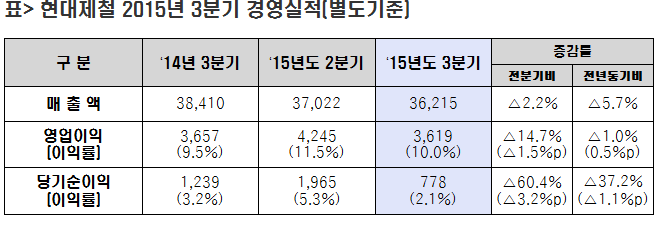 현대제철은 22일 공시를 통해 “별도기준으로 3분기 매출액 3조6,215억원, 영업이익 3,619억원, 당기순이익 778억원을 기록했다”고 밝혔다.