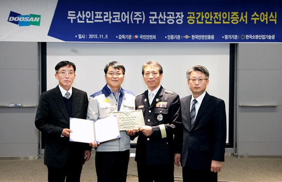 두산인프라코어(사장 손동연) 군산공장이 국민안전처로부터 공간안전인증을 획득했다고 6일 밝혔다.