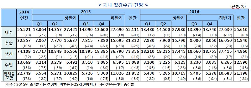 포스코경영연구원(POSRI)는 최근 수급전망 보고서를 통해 2016년에 내수ㆍ수출이 미약하게 증가하는 수입재 방어에 어려움이 예상된다고 밝혔다.