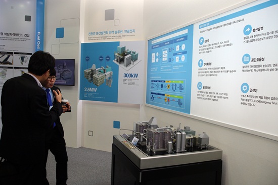 ▲포스코에너지(대 윤동준)는 신 재생에너지관 내 연료전지, 자원순환, 태양광, 풍력, 정부연구과제 등을 소개했다. 특히 시간당 3,000가구가 사용할 수 있는 발전용량에 해당하는 2.5㎿급 고효율 친환경 연료전지사업 분야를 소개했다. 자원순환분야는 부산 강서구 생곡동 일대 발전시설을 두고 부산시 생활폐기물 연료화 발전시설로 SFR(Solid Refuse Fuel)를 소개했다.