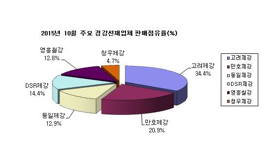 국내 경강선재 가공업체 주요 6개사의 2015년 10월 판매실적 집계자료에 따르면, 고려제강은 전월대비 0.6%p 높아진 34.4%의 판매점유율을 기록했다. 회사 측은 전월보다 내수, 수출을 각각 1,090톤, 190톤씩 늘렸다.
