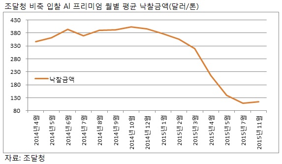 지난해 10~12월 톤당 400달러 이상의 프리미엄을 기록했던 국내 조달청 알루미늄 비축 입찰은 올해 들어 모두 톤당 400달러 아래를 기록해 왔으며, 지난 3월부터 7월까지 이뤄진 4번의 입찰은 연이은 가격 하락을 기록하면서 3월 톤당 320.8달러를 기록했던 프리미엄 입찰 금액은 4월 216달러에 이어 5월 140달러로 톤당 100달러대로 하락했으며, 지난 7월에는 톤당 108.4달러까지 떨어졌다.