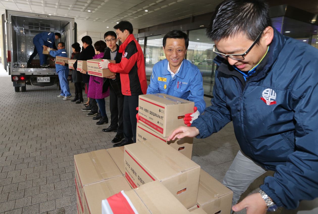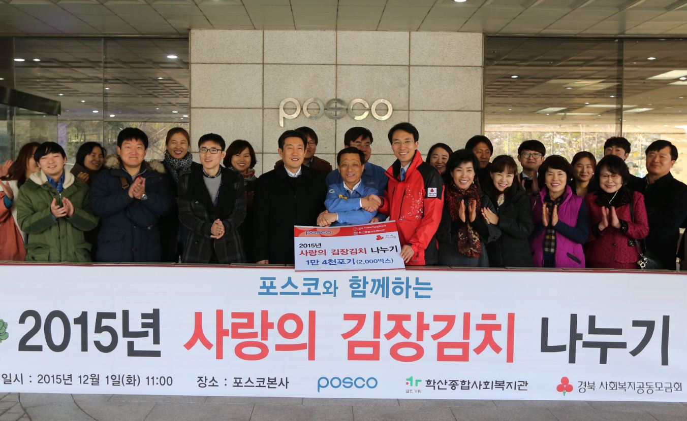 포항제철소는 지난 12월 1일, 포스코 본사 앞마당에서 김학동 포항제철소장, 김누리 경북사회복지공동모금회 사무처장 등 관계자 30여명이 참석한 가운데, ‘포스코와 함께하는 2015 사랑의 김장김치 나누기 전달식’을 개최, 김장김치 1만 4,000포기(2014년 1만포기 지원)를 학산종합사회복지관 및 포항지역 사회복지시설·기관 21개소에 지원했다.