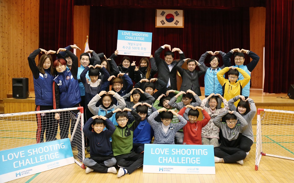 현대제철은 다양한 구호물품 중 축구공을 후원하기로 하고 '사랑의 슛' 이벤트를 펼쳤다. 이 이벤트는 축구단, 임직원, 학생 대표 25명이 페널티킥 형식으로 골을 넣어 15명 이상이 득점에 성공하면 개발도상국에 아동 교육용 축구공 후원 기금을 전달하는 방식으로 진행됐다.