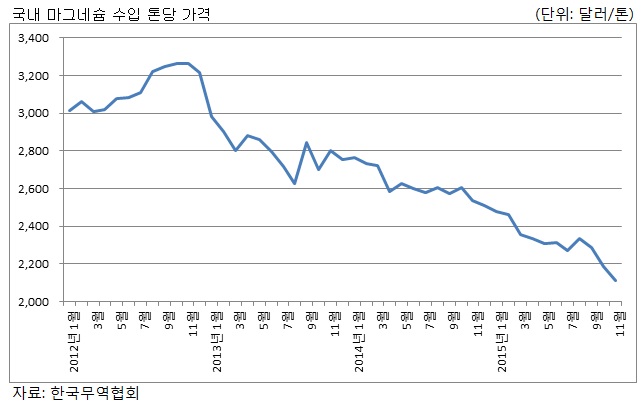 국내 마그네슘 수입 가격 하락세는 지난 2013년 1월 중국이 마그네슘 잉곳에 부과하던 10% 수출 관세를 폐지한 이후 줄곧 내림세를 나타내고 있다. 이로써 2013년은 톤당 2,805.4달러의 평균으로 톤당 3,000달러가 깨졌으며 지난해 한 해 평균 수입 가격은 톤당 2,619.7달러를 기록했다.