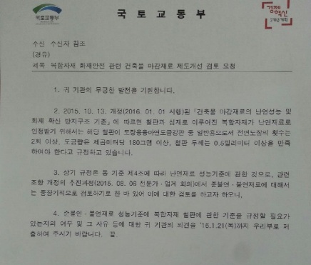 이에 국토교통부는 한국건설기술연구원과 한국발포플라스틱공업협동조합, 한국내화건축자재협회, 한국철강협회, 철강업체 등을 대상으로 ‘복합자재 화재안전 관련 건축물 마감재료 제도개선 검토 요청’에 대한 공문을 보냈다. 21일까지 업계 내 의견을 수렴한다.