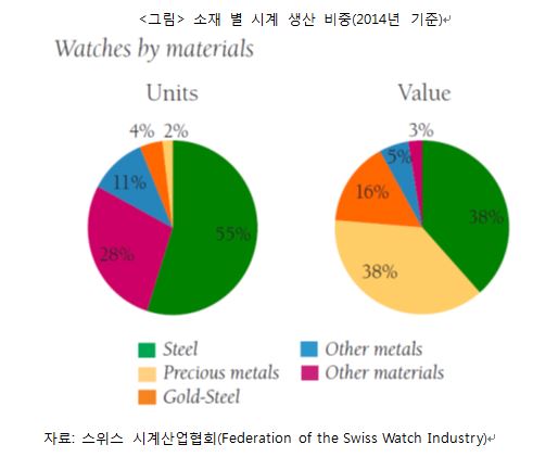 스위스 시계산업협회의 최근 발표 자료에 의하면 2014년 기준 전세계 생산되는 시계의 55%는 철강을 주 소재로 만들어지고 있다고 한다.