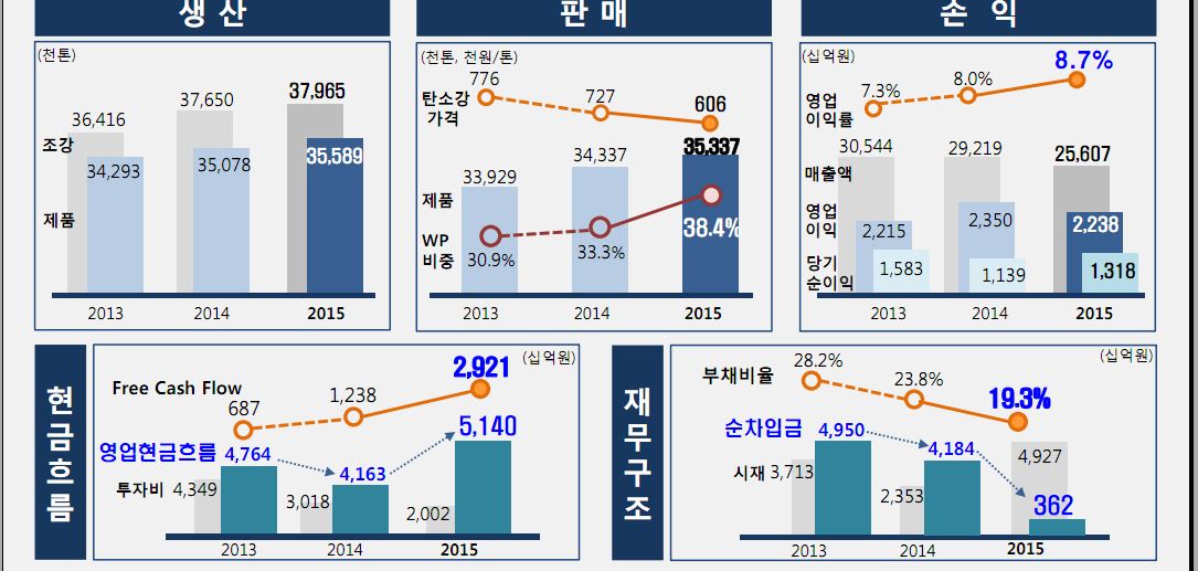 포스코(회장 권오준)가 지난해 판매가격 하락에도 WP제품 확대 및 원가절감으로 수익성을 개선한 것으로 나타났다.