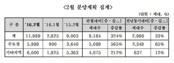 중견 건설사 모임인 대한주택건설협회는 회원사를 대상으로 2월 분양계획을 집계한 결과 29개 사업장에서 총 1만1,989가구를 공급한다고 2일 밝혔다. 공급물량은 전월(2,835가구)대비 324%, 전년(9,003가구)대비로는 33% 증가한 수치다.