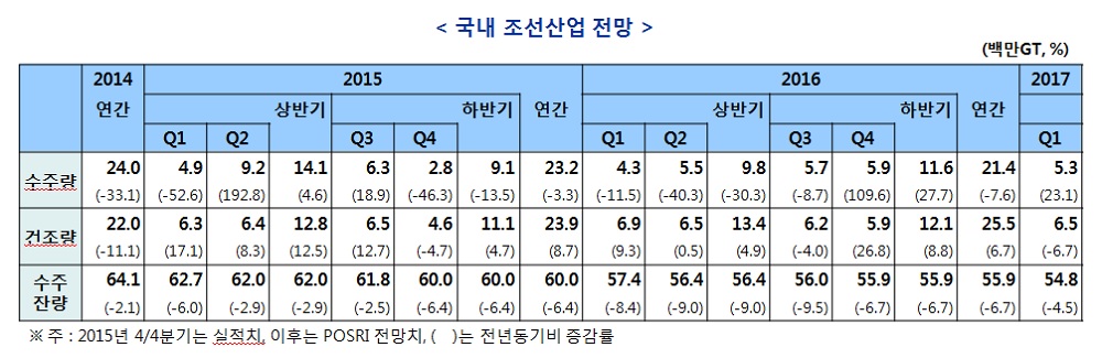 포스코경영연구원이 발표한 1분기 수급전망자료에 따르면 건조는 6.7% 증가해 2,550만GT를 기록하며 2년 연속 회복할 것으로 예상된다. 하지만 수주는 해운불황과 저유가 기조가 지속되면서 전년대비 7.6% 감소한 2,140만GT로 전망된다.