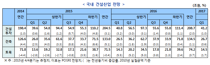 포스코경영연구소(POSRI)가 발표한 ‘1분기 국내철강수급전망’ 자료에 따르면 2016년 건설 투자는 2014년 이후 건설수주 회복세 영향으로 2% 증가율을 보일 것으로 전망됐다. 이는 2015년 3.1% 증가세를 이어가는 것이다.