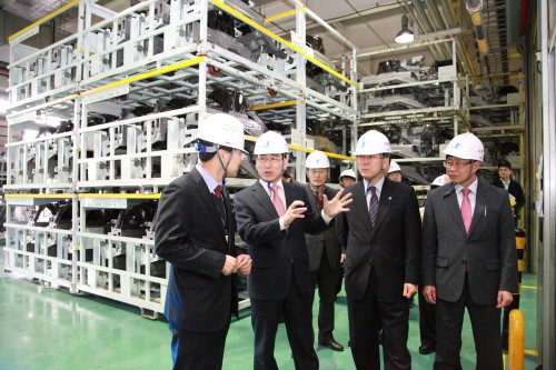 ▲ 박철구 부산본부세관장(왼쪽에서 두 번째)이 8일 성우하이텍 양산공장을 방문해 현장 관계자로부터 설명을 듣고 있다.<사진제공=부산본부세관>