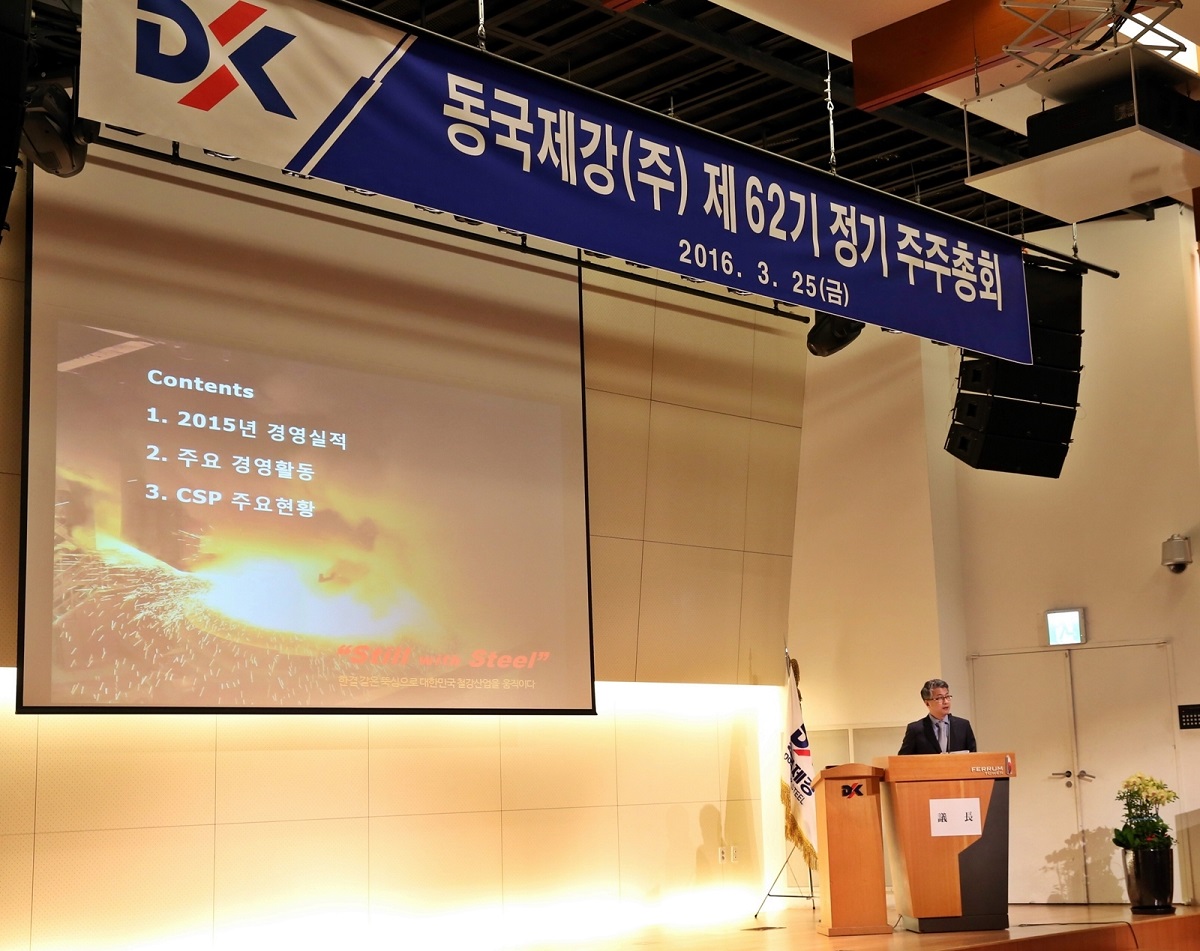 동국제강은 25일 본사가 위치한 서울 을지로 페럼타워에서 제62기 정기주주총회를 개최했다. 이날 동국제강은 기존 주주총회 방식을 대폭 바꿔 주주총회 의장인 장세욱 부회장이 주주들에게 경영현황을 프리젠테이션하는 등 주주들과 적극적인 소통에 나섰다.