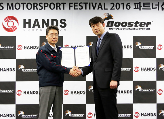 알루미늄 및 마그네슘 자동차 휠 전문 제조업체인 핸즈코퍼레이션과 BOOSTER 엔진오일 국내 수입원인 토탈엘엔씨(판매원 국보)가 인천에 위치한 핸즈코퍼레이션 본사에서 3월 31일, ‘핸즈 모터스포츠 페스티벌 2016’ 후원에 대한 Suppliers 파트너십을 체결했다.