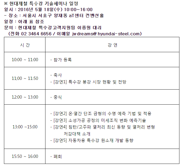 현대제철은 오는 18일 서울 양재동 aT센터 컨벤션홀에서 고객사와의 상생 발전을 위한 '제 1회 특수강 기술세미나'를 개최한다.