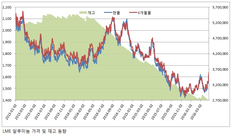 최근 1,400~1,500달러대의 약세를 기록했던 런던금속거래소(LME) 알루미늄 현물 가격이 31 거래일 만에 톤당 1,600달러를 회복했다.