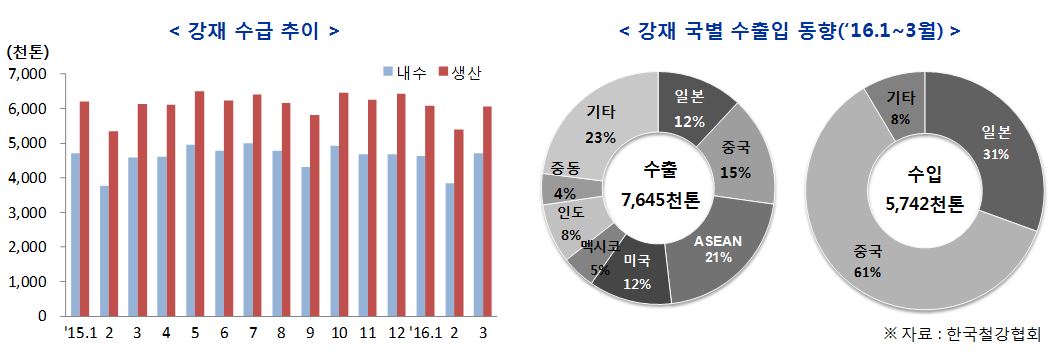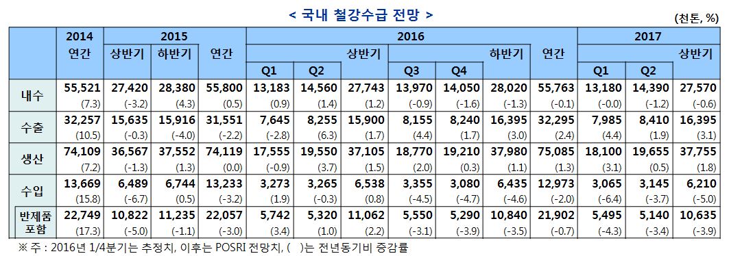 생산은 수출 증가와 내수 소폭 감소가 상충하면서 2015년 대비 1.3% 증가할 것으로 예상됐으며, 제품 수입은 소폭 감소 반면 반제품 수입 증가로 전체 수입은 여전히 2,190만2천톤을 기록할 것으로 예상돼 여전히 높은 수준을 이어갈 것으로 전망됐다.