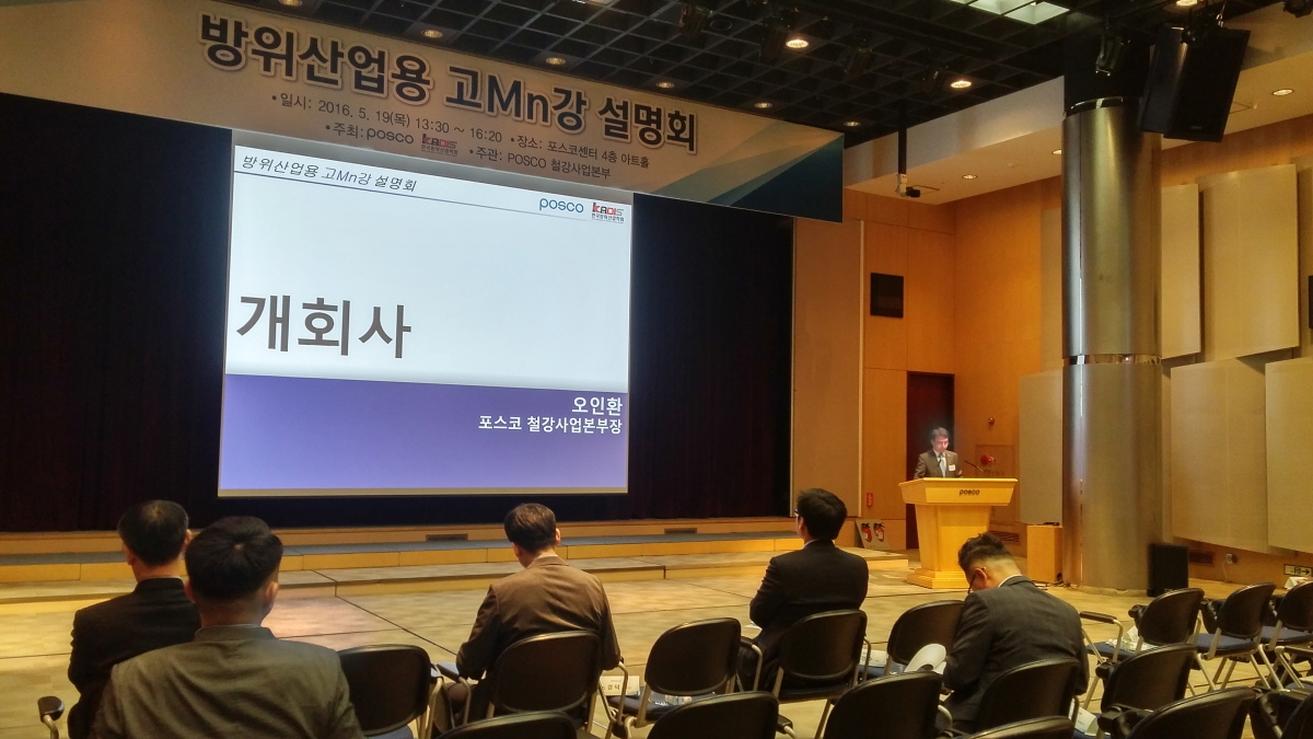 포스코 철강사업본부(본부장 오인환 부사장)은 19일 오후 서울 대치동 포스코센터 서관 4층 아트홀에서 '방위산업용 고Mn강 설명회'를 개최했다.