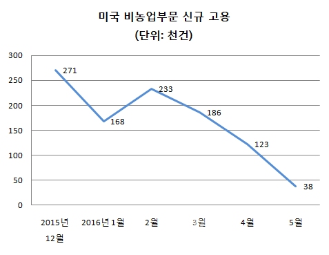 5월의 3만8,000건은 2010년 9월 이후 약 6년 만의 최저치이며 월스트리트저널의 예상치 15만8,000건과 블룸버그 통신의 예상치 16만건에 한참 못미치는 충격적인 기록이다.