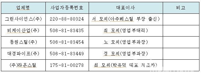 아울러 지난해 6월 대경파이프(주), 비케이산업(주), 동원스틸(주) 등 3개 회사의 대표자를 영업부직원으로 각각 변경해 또 다른 페이퍼컴퍼니를 설립했다. 박 대표는 이러한 방법을 통해 총 4억7,300만원의 부당이득을 취득한 것이다.