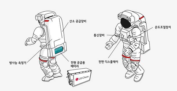 우주복에는 우주 비행사의 생명 보존을 위한 산소 공급 장비, 통신장비, 방사능 측정기 등 다양한 기능이 구비돼 있다. LG화학의 배터리가 이러한 최첨단 장비의 심장 역할을 하게 되는 것으로 알려졌다.